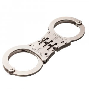 Material em aço carbono AISI 1020,Tratamento da superfície niquelado prata fosco,Tipo de ligação por dobradiça,Sistema de fechamento por dentes e catraca,Sistema de segurança com trava anti-lesão,Acompanha duas chaves em aço AISI 1020 na cor da algema. Distância total: 19,4cm,Máxima abertura: 7,4cm,Mínima abertura: 5,2cm,Peso: 317g.